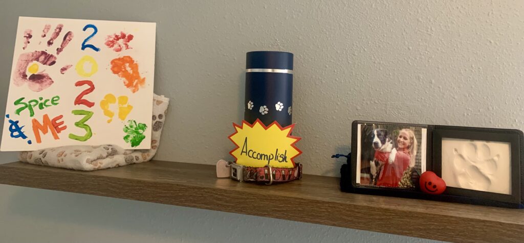 Every time I sit down to write, I feel Spice with me. This office is the space where she and I spent so many days side by side. Now, her paw wind chime hangs in the window, and above my desk sits a shelf filled with her blanket, her urn, her paw print in stone, her collar, and a painting we made together of her paw prints pressed beside my handprints in 2023.